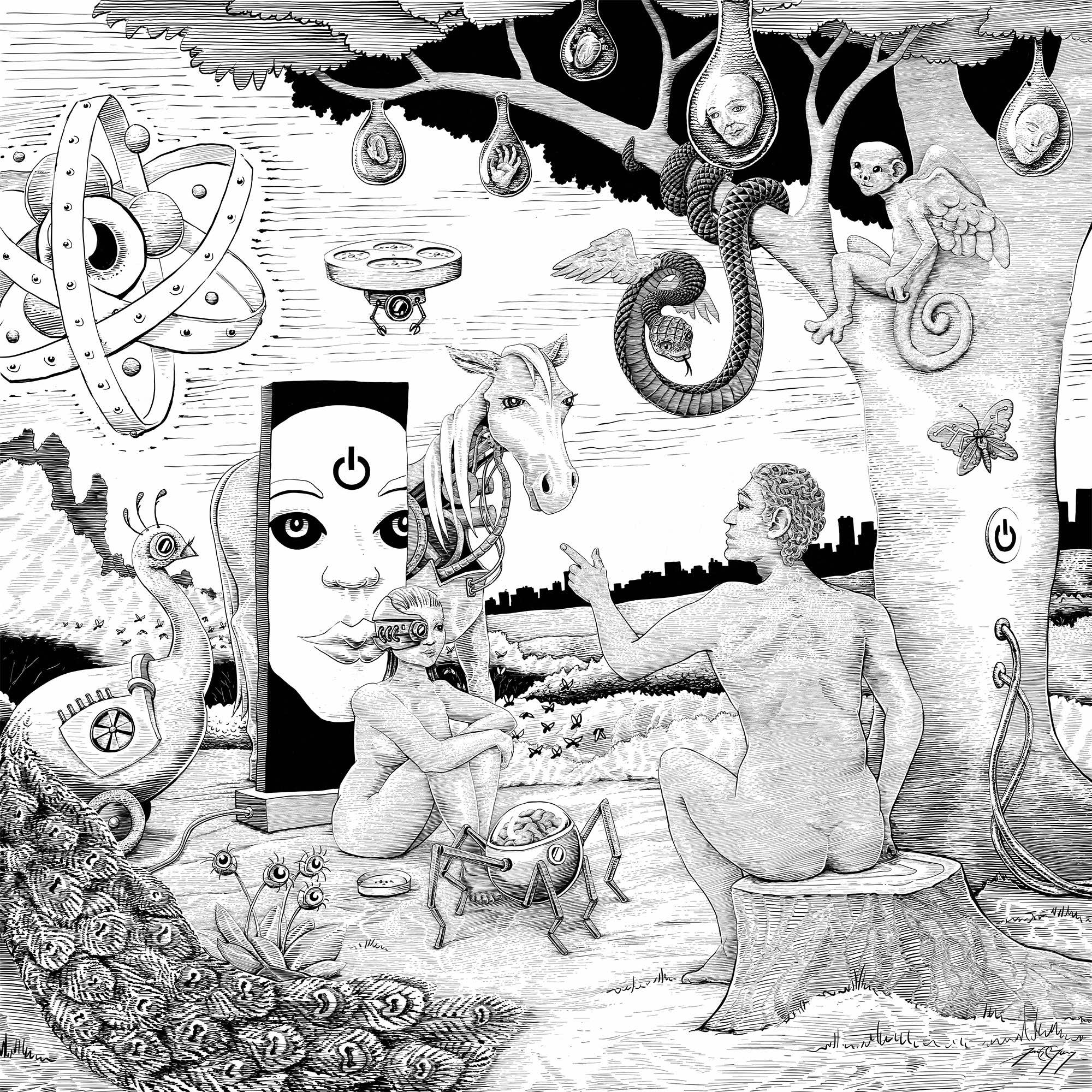 The Xenobots, Anthrobots, and many other novel constructs that reveal the plasticity and interoperability of life are just early steps, along with the field of Artificial Life, AI, and human augmentation. Thus, I asked the incredibly talented Jeremy Guay to re-imagine the classic Garden of Eden painting from this perspective (described in more detail here and here):
