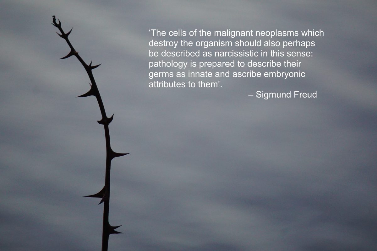 In one of your talks, Micheal, you characterize cancer cells as narcissistic in the sense that they see everything outside themselves as outside and only their own boundary as inside— so nothing outside actually matters to them. A human body does the same thing, only it draws its boundaries around its own edges.
